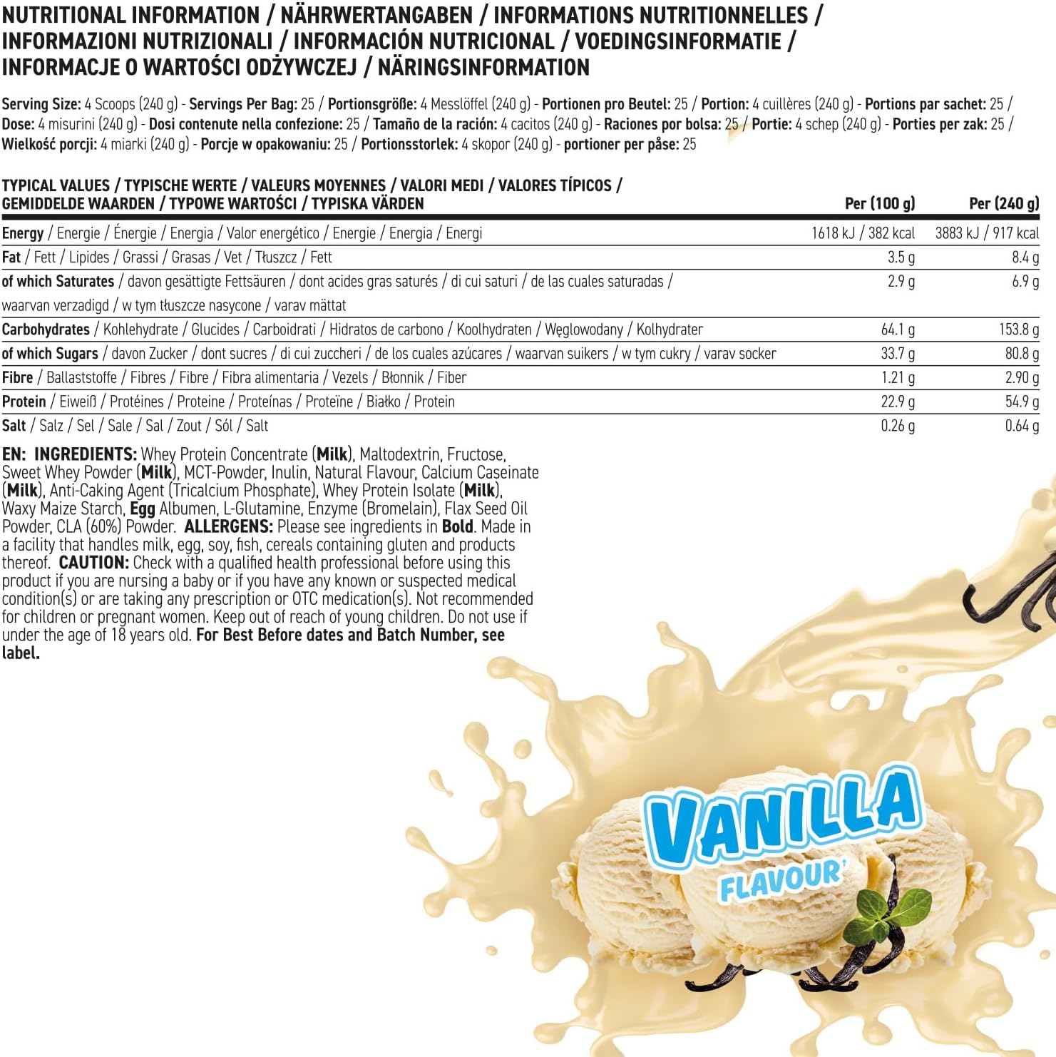 Mezcle 4 cucharadas (240 g) con 500-1000 ml de leche o agua y agite bien en una coctelera. Consuma de 1 a 3 porciones diarias según sus necesidades calóricas.