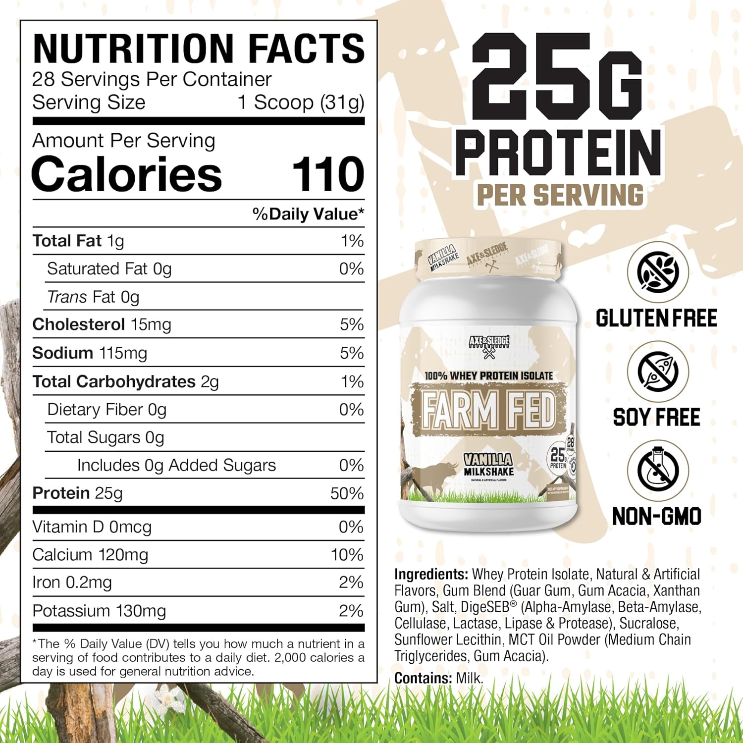 - Farm Fed es un aislado de proteína de suero 100% alimentado con pasto con enzimas digestivas añadidas (como DigeSEB) para mejorar la absorción de nutrientes y la digestión