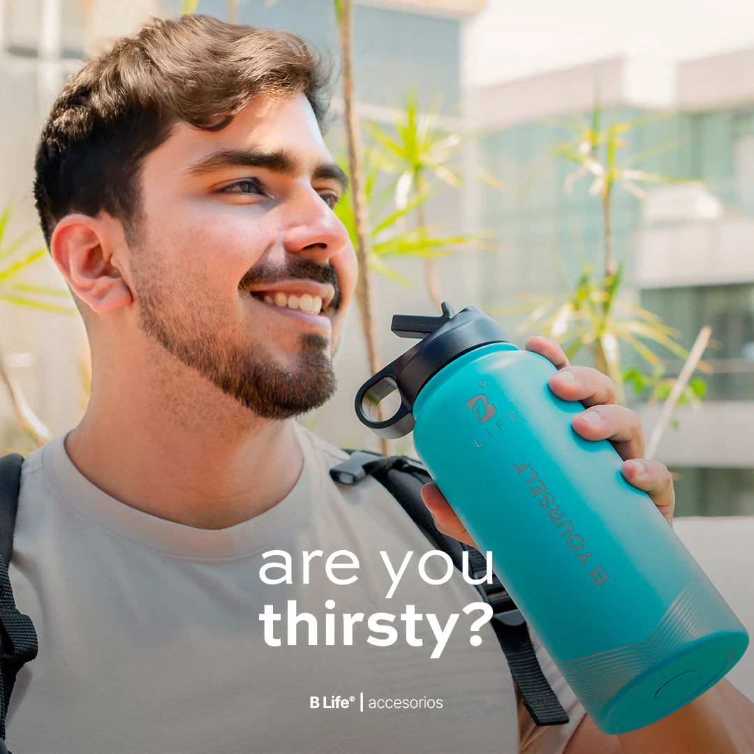 ¡Botella térmica B Yourself B Life®, para un estilo de vida activo! Nuestro termo de acero inoxidable de 1 L es ideal para bebidas frías y calientes, manteniendo su temperatura por hasta 12 horas.