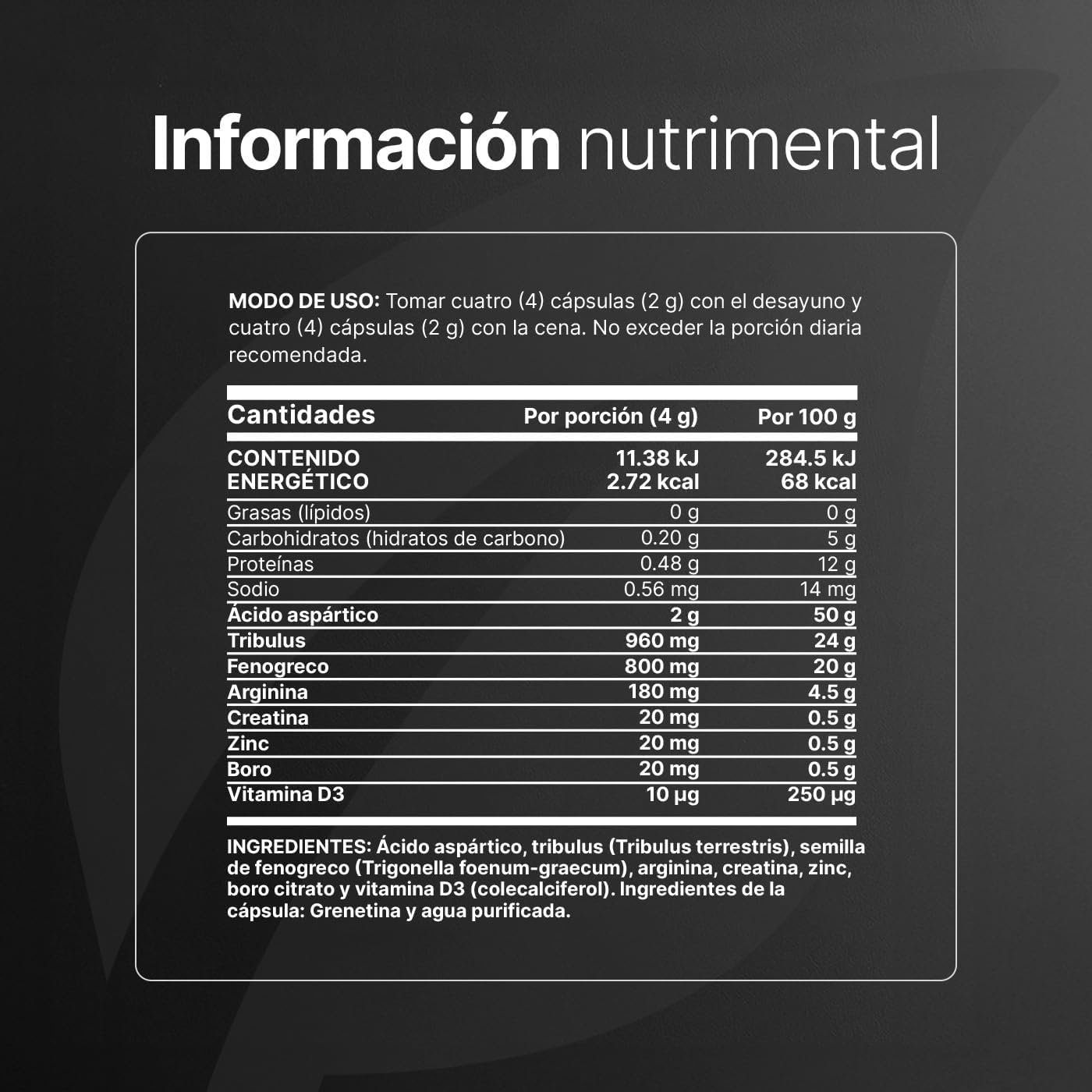 Ácido aspártico, Tribulus, Fenogreco, Arginina, Creatina, Zinc, Boro y Vitamina D3.