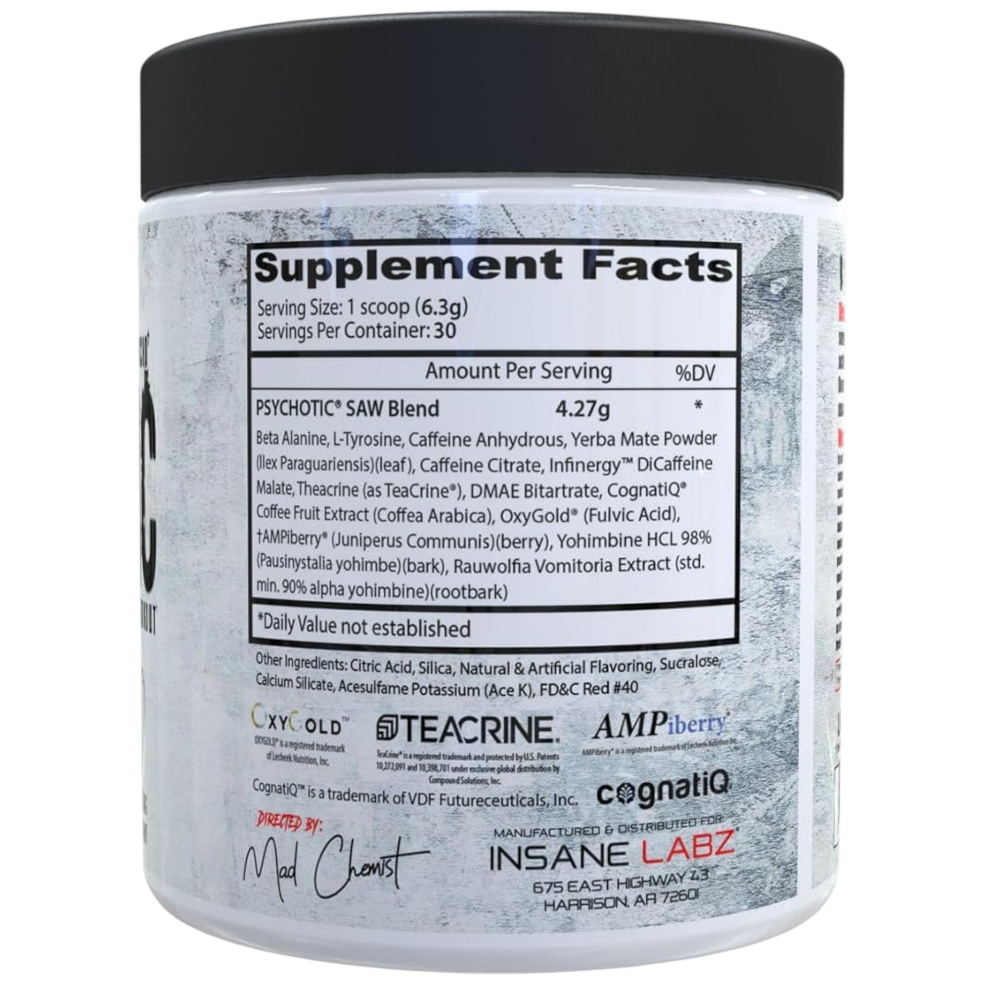 ¿QUIERES JUGAR UN JUEGO? Psychotic SAW es el preentrenamiento más INSANO jamás realizado por el Químico Loco y su equipo en Insane Labz. ¡Han empaquetado la fórmula LLENA de ingredientes que trabajan juntos para darte todo lo que necesitas para MATARLA en el gimnasio! A continuación, expande cada uno de estos ingredientes para aprender qué hace que Psychotic SAW sea diferente a cualquier preentrenamiento que hayas probado.