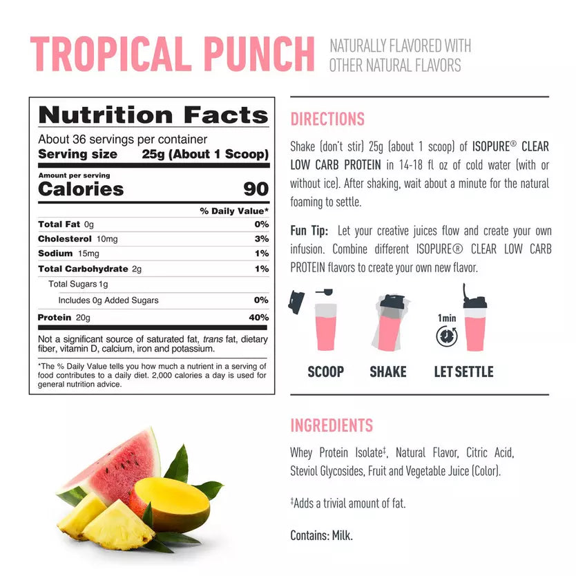 ISOPURE Clear Low Carb Protein mejora el agua con sabores refrescantes y afrutados y 20 g de proteína ultrafiltrada en cada porción. Hecho con 100% aislado de proteína de suero para una pureza excepcional, sin edulcorantes ni sabores artificiales, sin azúcar agregada* y solo 5 ingredientes en total, solo obtienes lo que quieres y nada que no quieras. ¡Simplemente saca, agita, deja reposar y disfruta de una forma completamente nueva de beber agua con proteínas adicionales y seis deliciosos sabores de frutas!